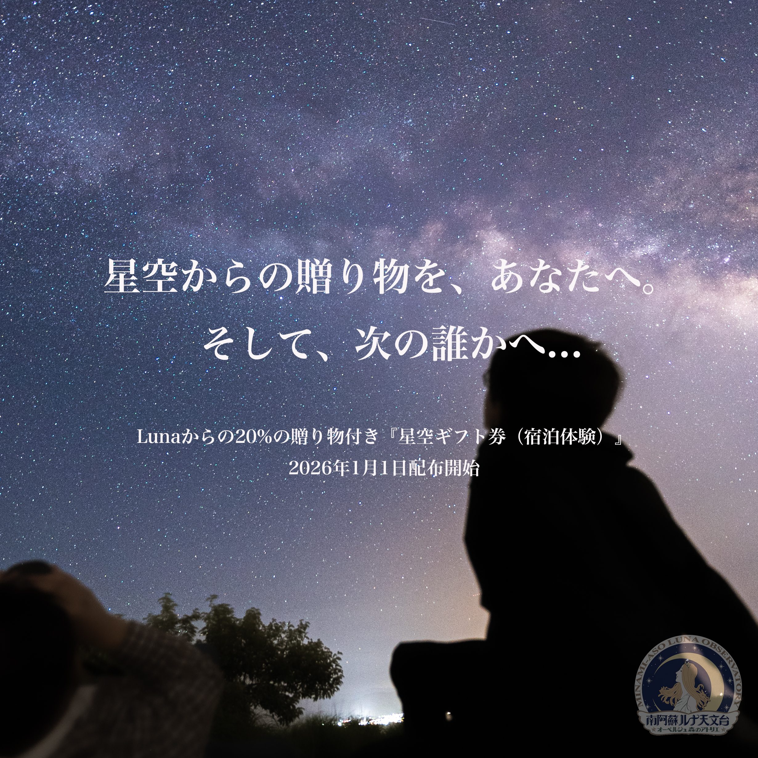 星空からの贈り物を、あなたへ。そして、次の誰かへ... 【期間限定】Lunaからの贈りもの付き 『星空ギフト券(宿泊商品券)』の販売を開始しました ギフト券と90日前までの早期予約 併用でLunaでのご宿泊が40%OFF!! 【2026年2月1日追記】 ご購入が間に合わなかった方や、 ご検討中の方からの要望を受け、 ...